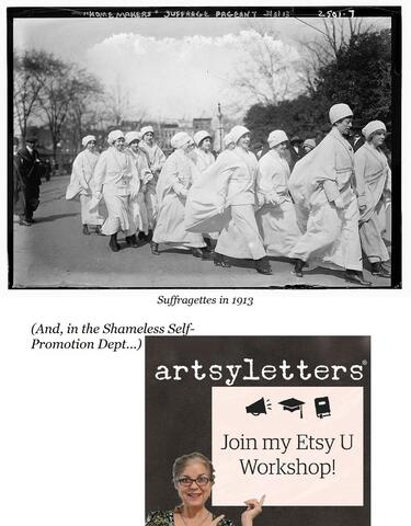 And, the completely unrelated and blatantly shameless promotional picture below those ancestral sisters marching in 1913? That's me, just getting the word out that I'm offering three online workshops this September after participating in trainings to be an "Etsy U" instructor. If you or someone you know has an Etsy shop and might be interested in some Etsy-generated tips, march on over to artsyletters.com, where you'll find more info and registration links.