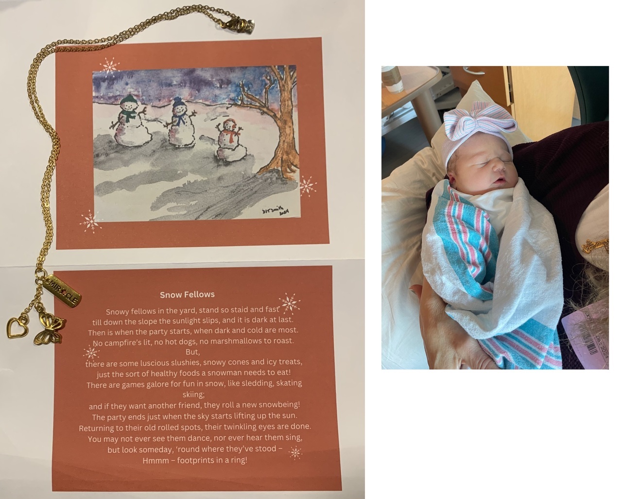 Before we left on our trip, I got a wonderful surprise package from Maine - from Donna JT Smith. Not only was there a lovely card, but she had sent the fun painting and poem above and a lovely gold necklace featuring three charms: a heart, a butterfly, and a little tag with a cut-out star reading "MIRACLE." I wore that necklace every day for a week, I guess - before Ellie Grace was born and for several days after. (You can see it in the photo above.) I emailed Donna with thanks for her kindness, and told her the gift was so meaningful as both of these babies are miracle IVF babies!
