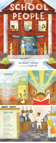 …this collection of poems paired with imaginative artwork introduces readers to the important grown-ups they’ll meet at school. From the school’s own story, written by Rebecca Kai Dotlich, to J. Patrick Lewis’s “Principal,” to Alma Flor Ada’s "Spanish Teacher," each poem features the women and men who inspire, encourage, and help children in their own unique ways.The small format of photos allowed on my blog don’t do justice to the vibrant illustrations by Ellen Shi, but you can get an idea. The publisher kindly shared a couple of interior spreads – “Librarian” by Lee himself, and my own poem, “Lunch Lady.”