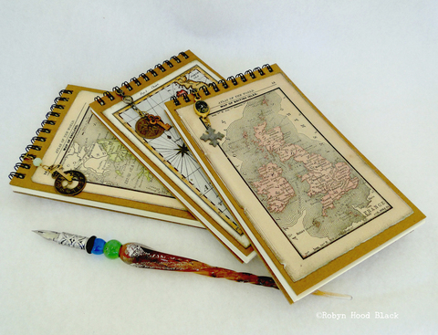 Re. notebooks and journals, I plan to create more options and one-of-a-kind pieces this year in my Etsy shop. For now, I'm adding a few new 4X6 journal/sketchbooks to the ones featuring 1888 map images of Ireland and Scotland (which I'm happy to report sell well, and have even been taken by travelers across the Pond on special trips, according to customers). This week I'm adding England and The British Isles, and another featuring a circa 1800 map image (with a compass!) of the Atlantic from England to the Canaries. I offer a couple of "teeny wee" notebooks as well, for smaller pockets. Here's a link to my shop's journals section.