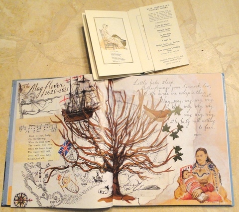 I couldn't find "proof" of the "Hush-a-bye" lullaby's origins, though it seems to be held by many that it was written by early English visitors to America, who noted how Native American mothers hung birch-bark cradles in trees, allowing the wind to rock their infants. There are other theories as well, but in OVER THE HILLS..., Gill's illustration depicts the Mayflower and pre-colonial coastline, and it's opposite a Chippewa lullaby ("Little baby, sleep,/Mother swings your hammock low...) and a lovely painting of a Native American mother and baby.