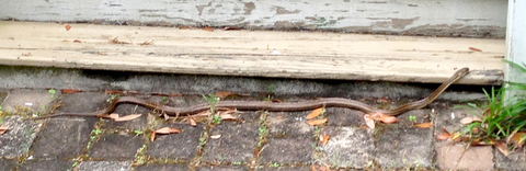 A few weeks ago, I had just returned from a road trip and noticed a package on the front steps of the house. At the top of the steps, I picked up the package and turned around, and that's when I noticed Mr. (Mrs.?) Good-sized Garter Snake, stretched out on the ground the entire length of the steps (four to five feet?) and watching me intently. I must have stepped right over him/her.